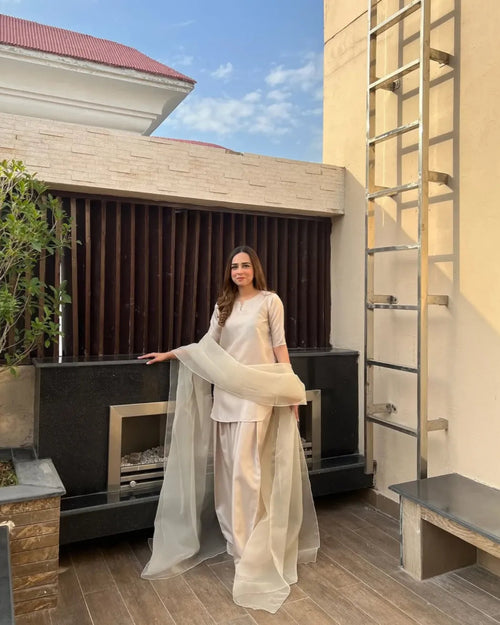 Step into timeless grace with Zarqash — a mesmerizing 3-piece Kattan Silk ensemble designed to capture attention. This luxurious outfit features intricate handmade adda work on the shirt, exuding traditional charm blended with modern sophistication.